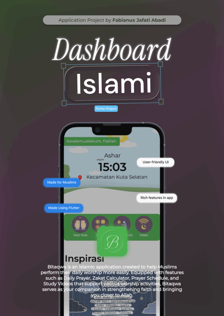 I developed it using Flutter, a framework that helps me design beautiful and responsive mobile apps. From this project, I learned how to create an interactive dashboard, manage layouts, and plan feature connections for future updates of Bittaqwa App. I’m excited to continue developing the next parts and make this app even more useful for daily Islamic activities.