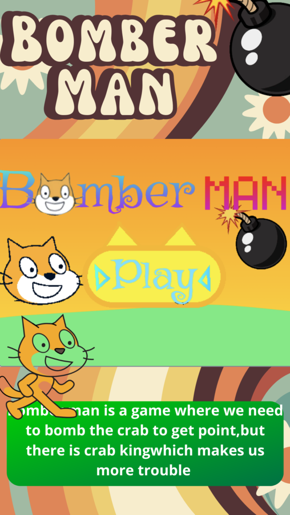 Bomberman is a game that you have to kill enemy that is crab to kill it you have to place bomb and if the crab touch the bomb the crab will died and you point is +1 and this game is endless so you can play this game as long as you can.