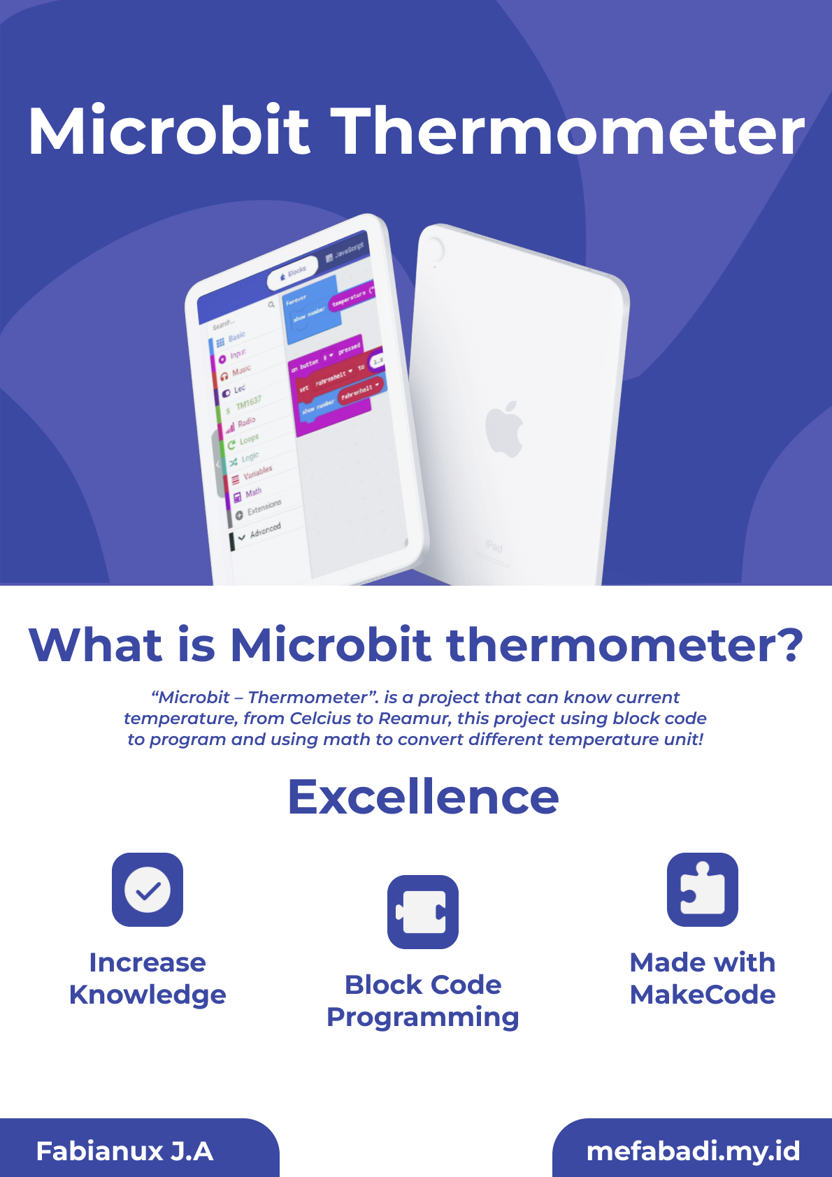 Hi everyone, This is my project in IT Lesson to accomplish the target, this project i have to make a video about an IT project i have created. My project name is “Microbit – Thermometer”. is a project that can know current temperature, from Celcius to Reamur, this project using block code to program and using math to convert different temperature unit