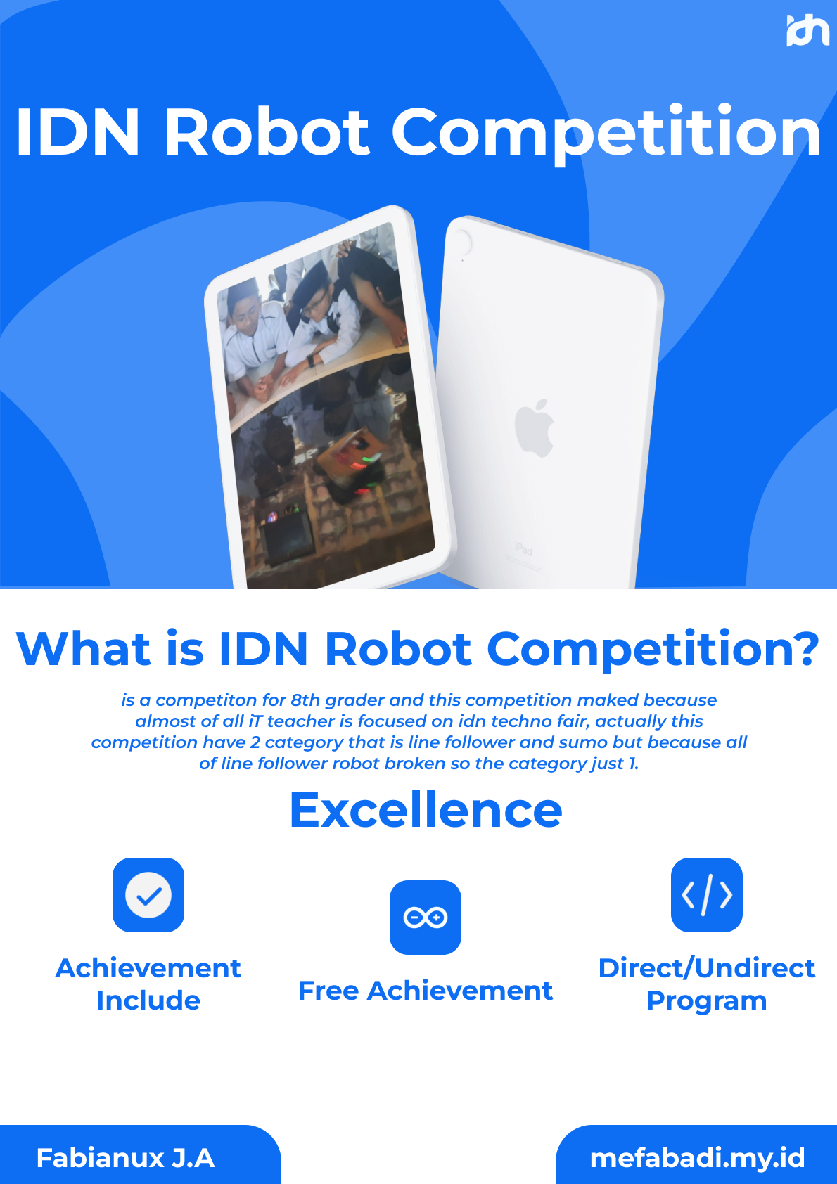 Hi everyone, This is my project in IT Lesson to accomplish the target, this project i have to make a video about an IT project i have created. My project name is <span data-metadata=""><span data-buffer="">“IDN Robot Competition”. is a robotic competition for 8th grader and this competition have 2 category sumo and line follower but bc the line follower broken the category in competition just sumo category .